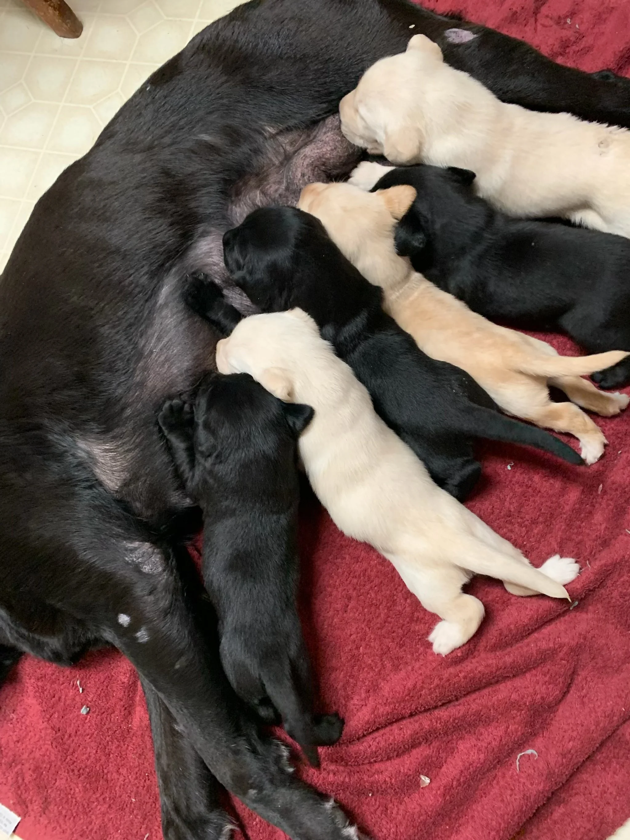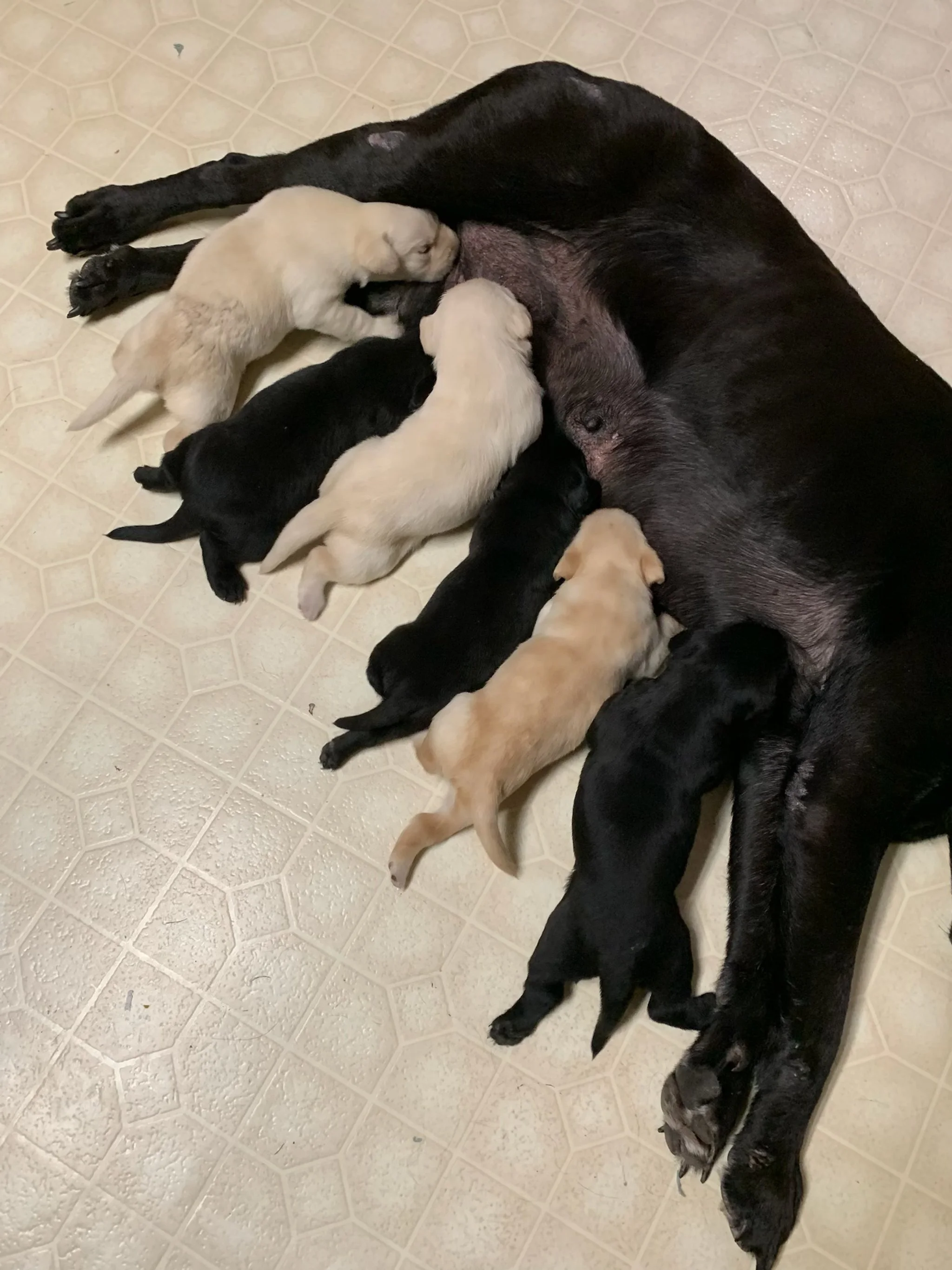 Mực’s puppies were born July 9, 2025 and will be ready September 3, 2025. There are 3 males (1 yellow and 2 black) and 1 females ( black) puppies. We are taking deposits for this litter. If you are interested in a puppy from our next litter, please review the “Frequently Asked Questions” page for more details.
